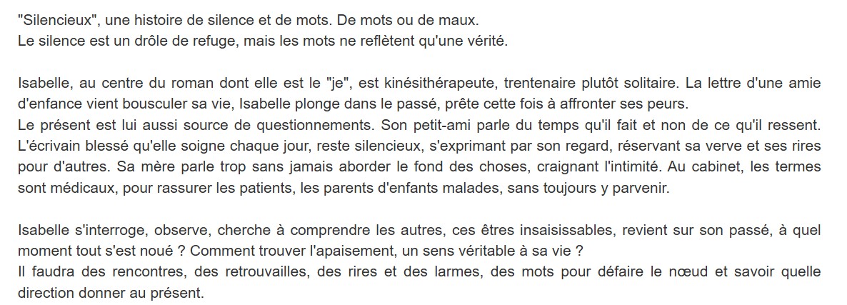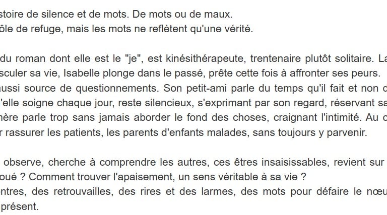 Pas envie de lâcher ce roman, envie de rester avec Isabelle, la suivre, être près d’elle dans les péripéties affectives de sa jeune vie, avec sa mère, ses amoureux, ses patients. Car Isabelle est une affective têtue, même dans ses doutes, qui se laisse guider par son cœur. Personnage tellement vivant et incarné, Sophie STERN lui donne une existence pleine. Grâce à une voix au je, et à un sens de la notation sensible et intime.